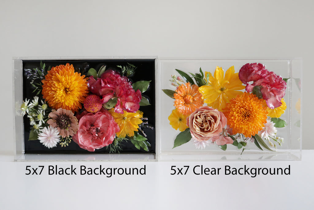 -Flowers should be dropped off within 1-5 days of the event for best preservation. Real flowers will be preserved, then encased in resin inside the acrylic box.