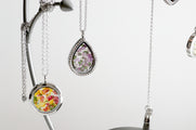 -Real flowers will be dried before the petals are airbrushed, broken up into small, confetti-like pieces, and encased in resin inside the pendant charm.