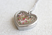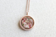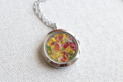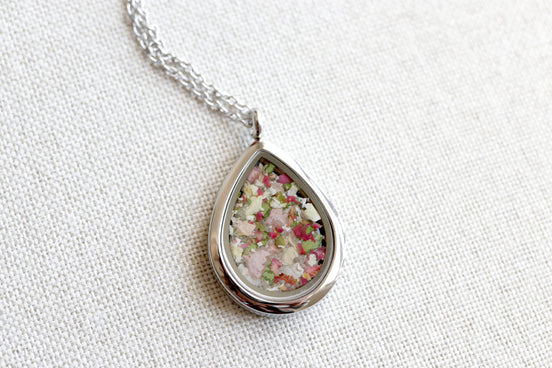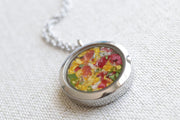 This pendant necklace is a perfect gift for yourself or loved ones using flower "confetti" from a significant life event, such as a wedding or funeral. Bits and pieces of dried floral confetti will be airbrushed and then layered with a high-quality epoxy resin to create both a meaningful and functional work of art. The necklace is made inside a strong stainless steel locket that is rust and tarnish resistant, creating a meaningful keepsake that you can always keep close to your heart.